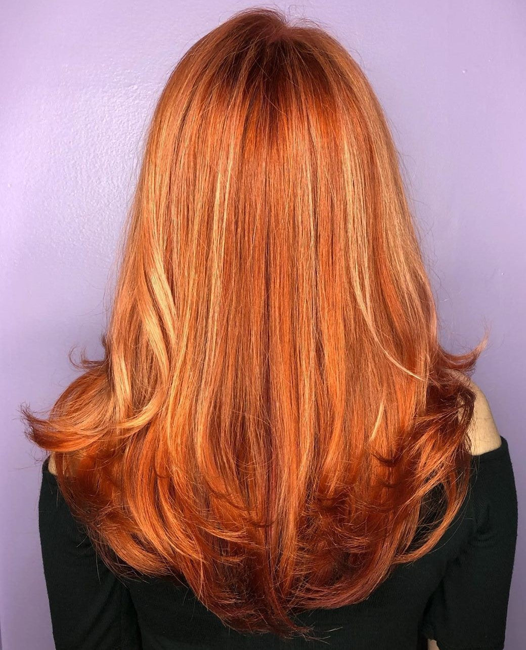 A vibrant copper look with rosy and strawberry blonde pieces. Quite invigorating!